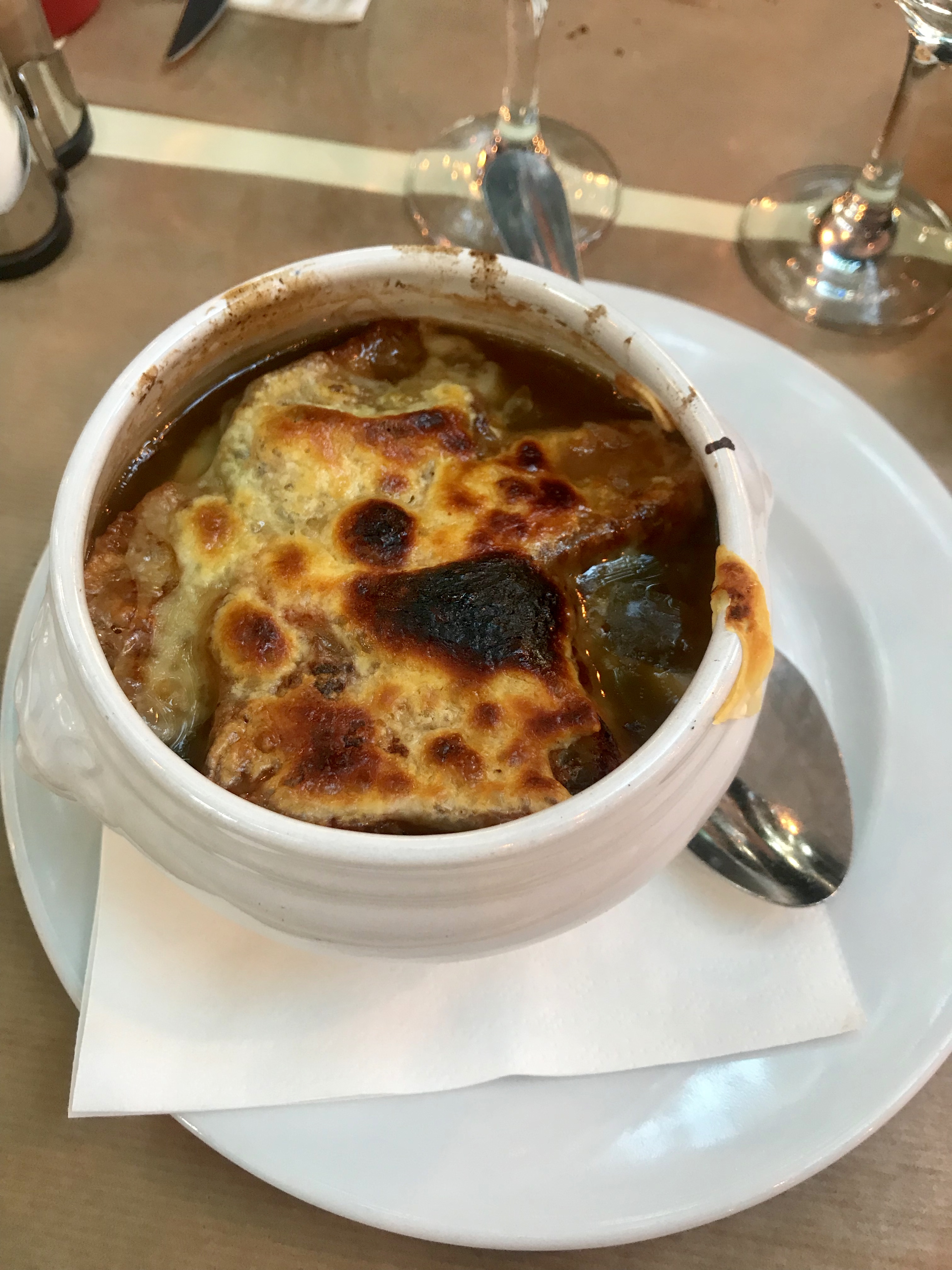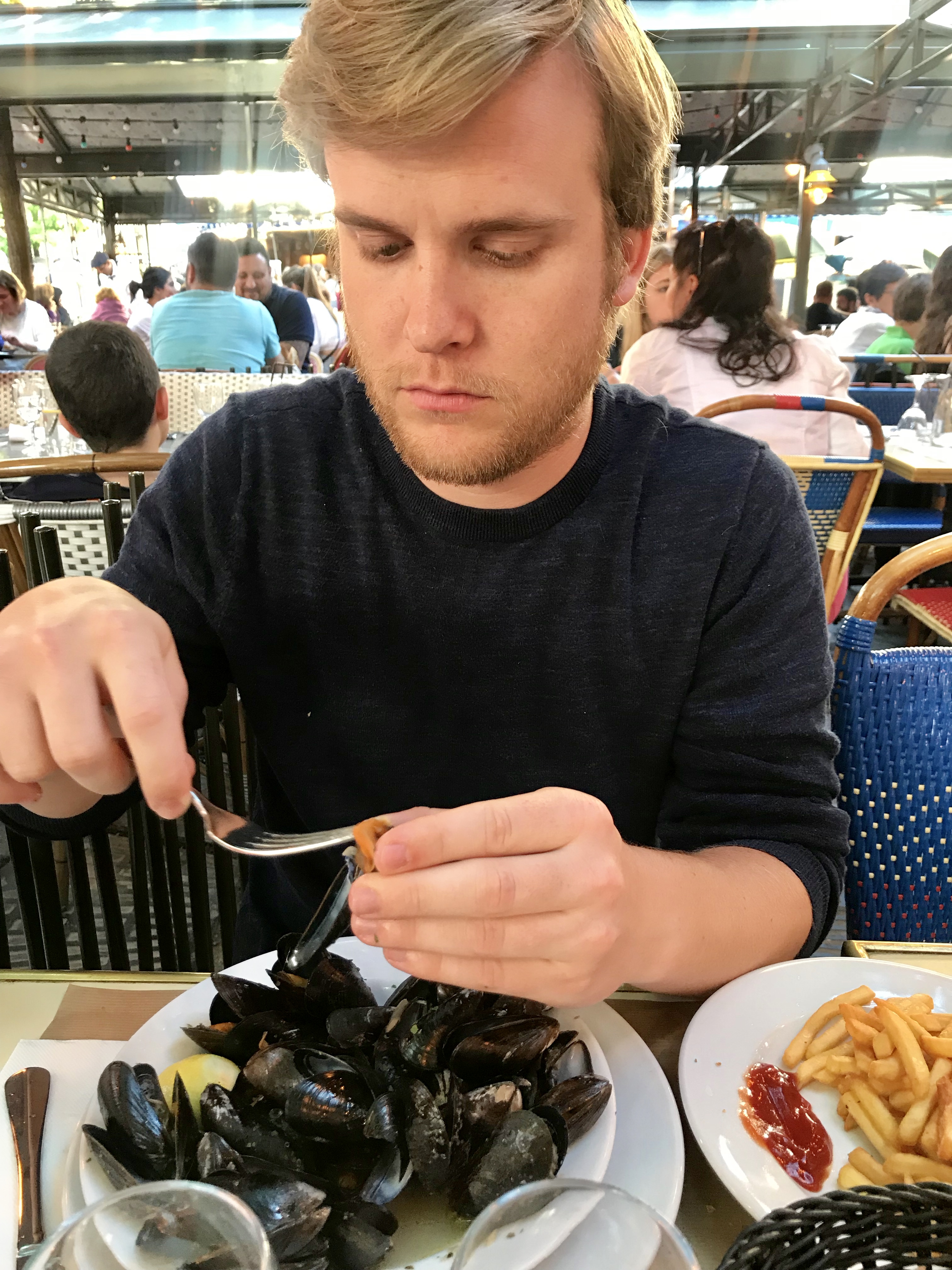 Our next adventure was a walking tour of Montmartre. This ended up being one of my favorite things that we did in Paris. The history of that area is fascinating! Before we went, I simply had to have a Nutella crepe, and yes, it was divine. We stood outside the Moulin Rouge, walked the streets of Picasso, Monet, and Renoir, learned about a pop star named Dalida, and other artists. We finished the tour by going through the Sacré-Cœur Basilica. Afterwards, we had a delicious Parisian dinner surrounded by artists. I had French Onion Soup, a staple for the aforementioned artists, and Marcus had mussels and fries. Yum!
