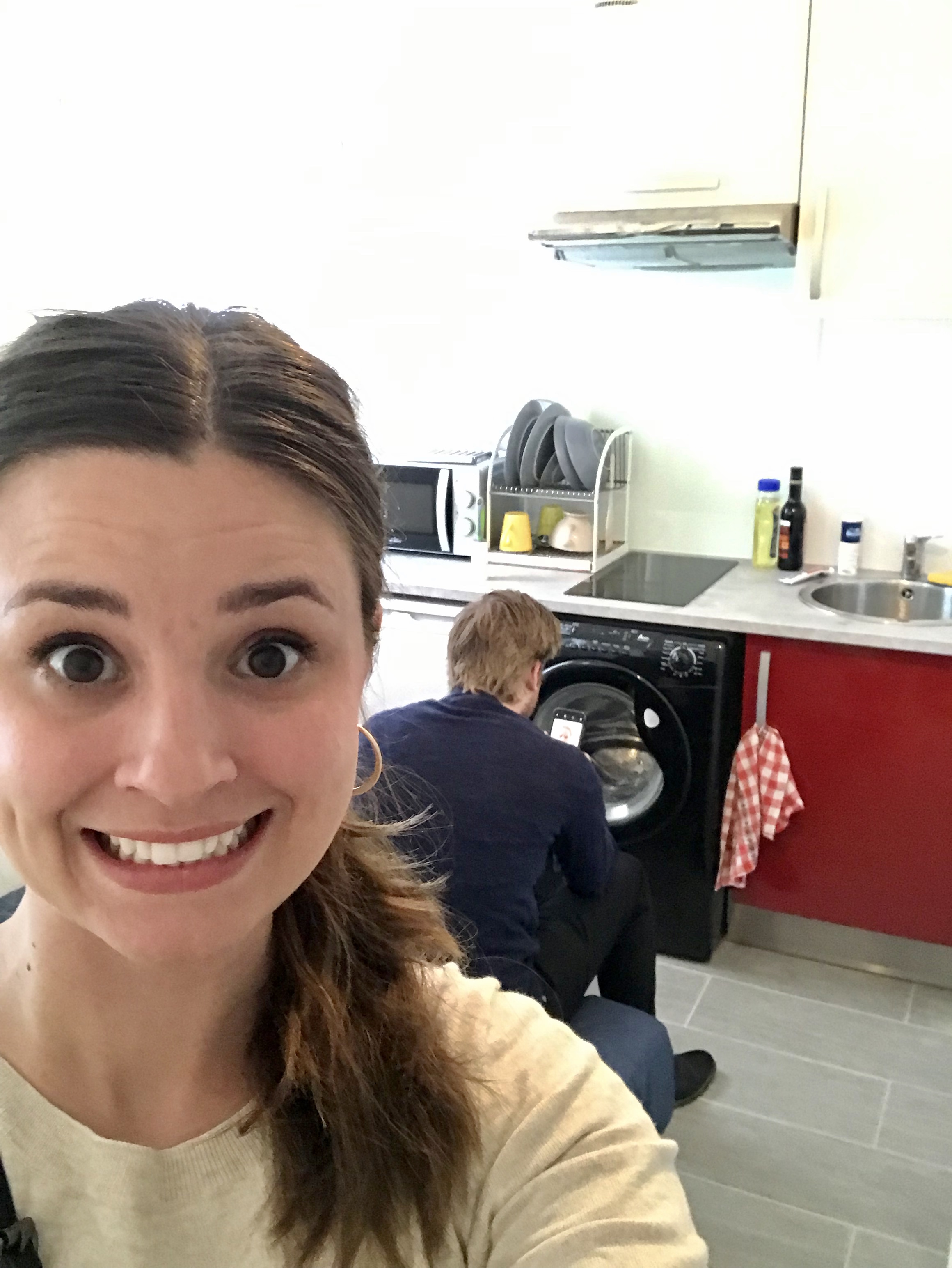 On our street was a cute little Patisserie, so we bought some AMAZING French pastries right away. Croissants, eclairs, and a chocolate chip baguette was our first meal in Europe! We had a cozy day in our apartment dealing with WiFi issues, realizing that the water gets unbelievably hot, and eating lots of rice and eggs. Our apartment was so small, but somehow fit a bed, stove, fridge, washer, bathroom, shower and a closet. The picture here has me standing at the edge of the room and you can see where it ends behind me!