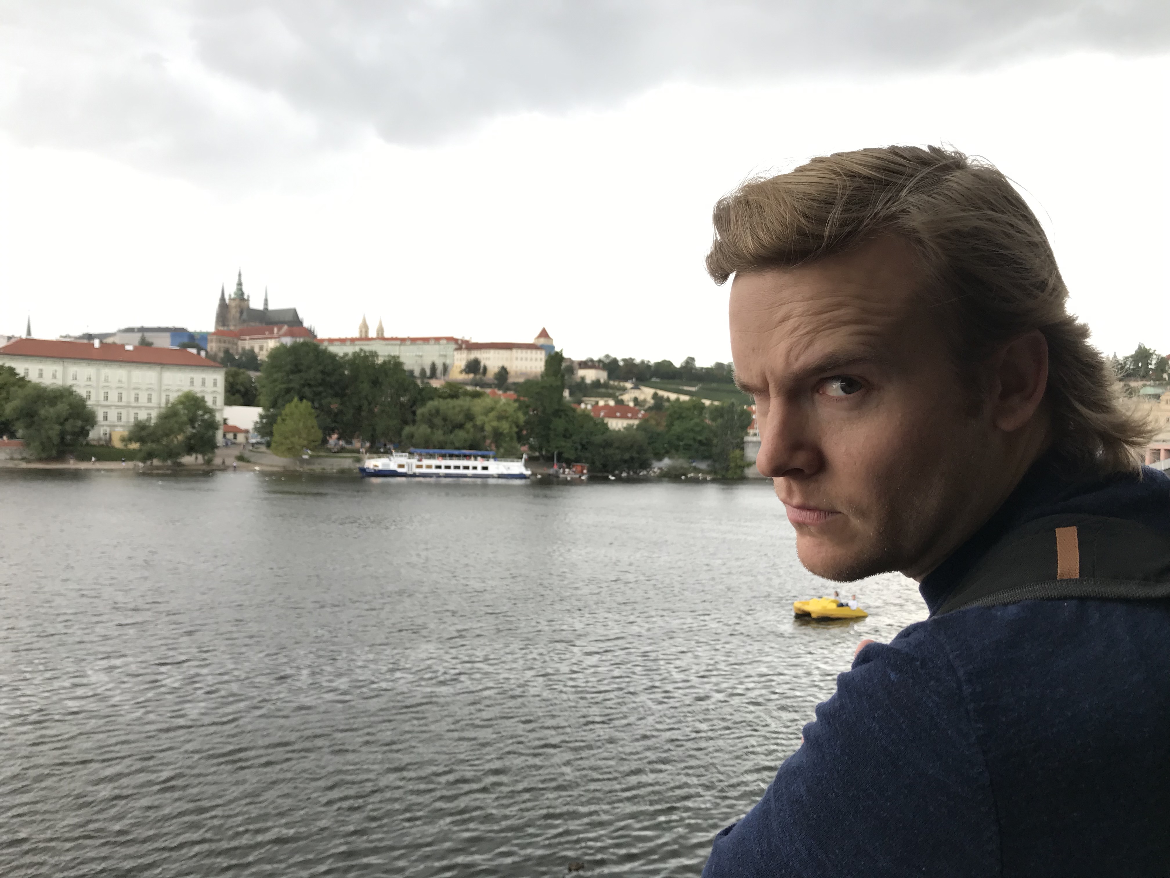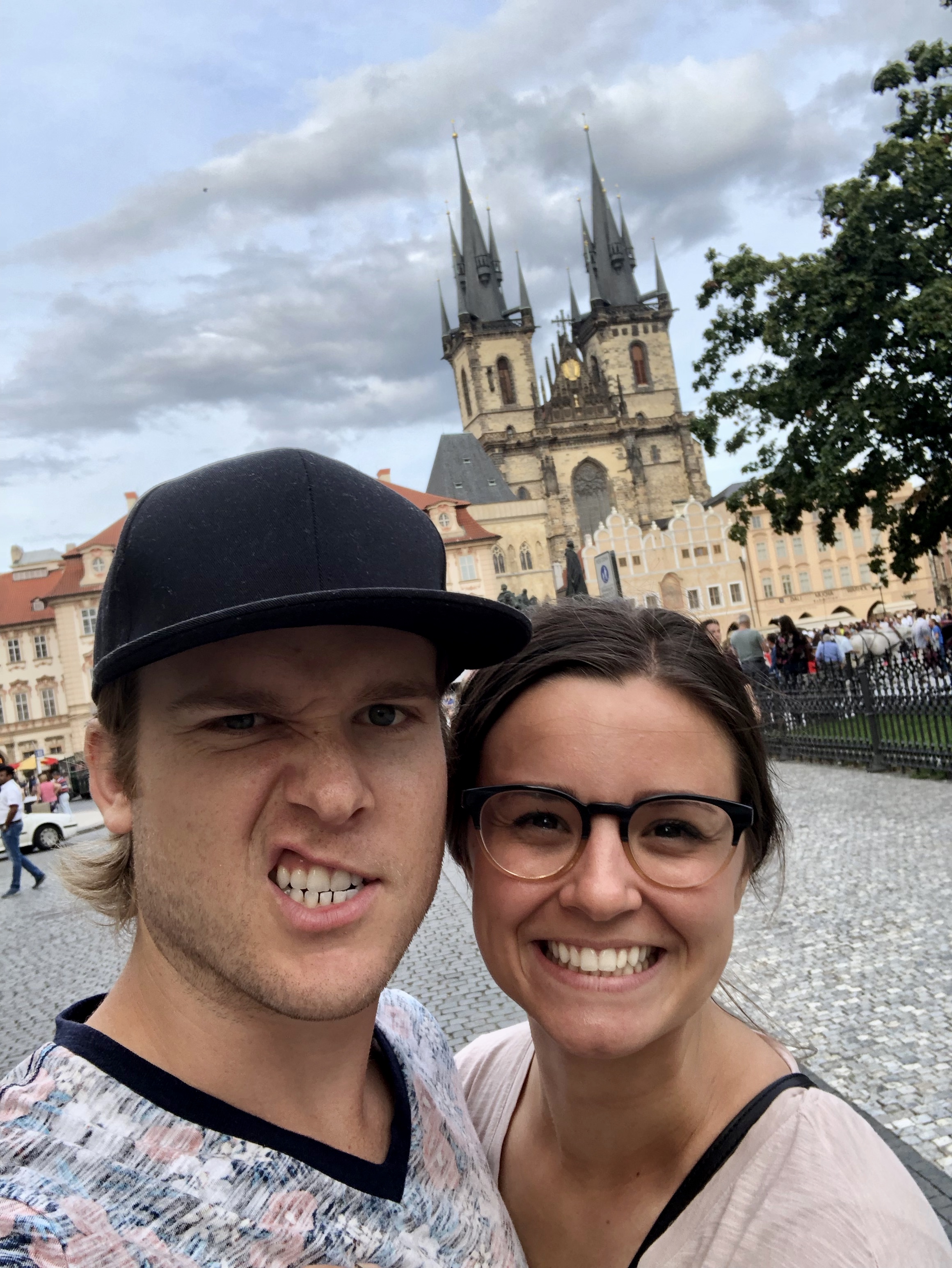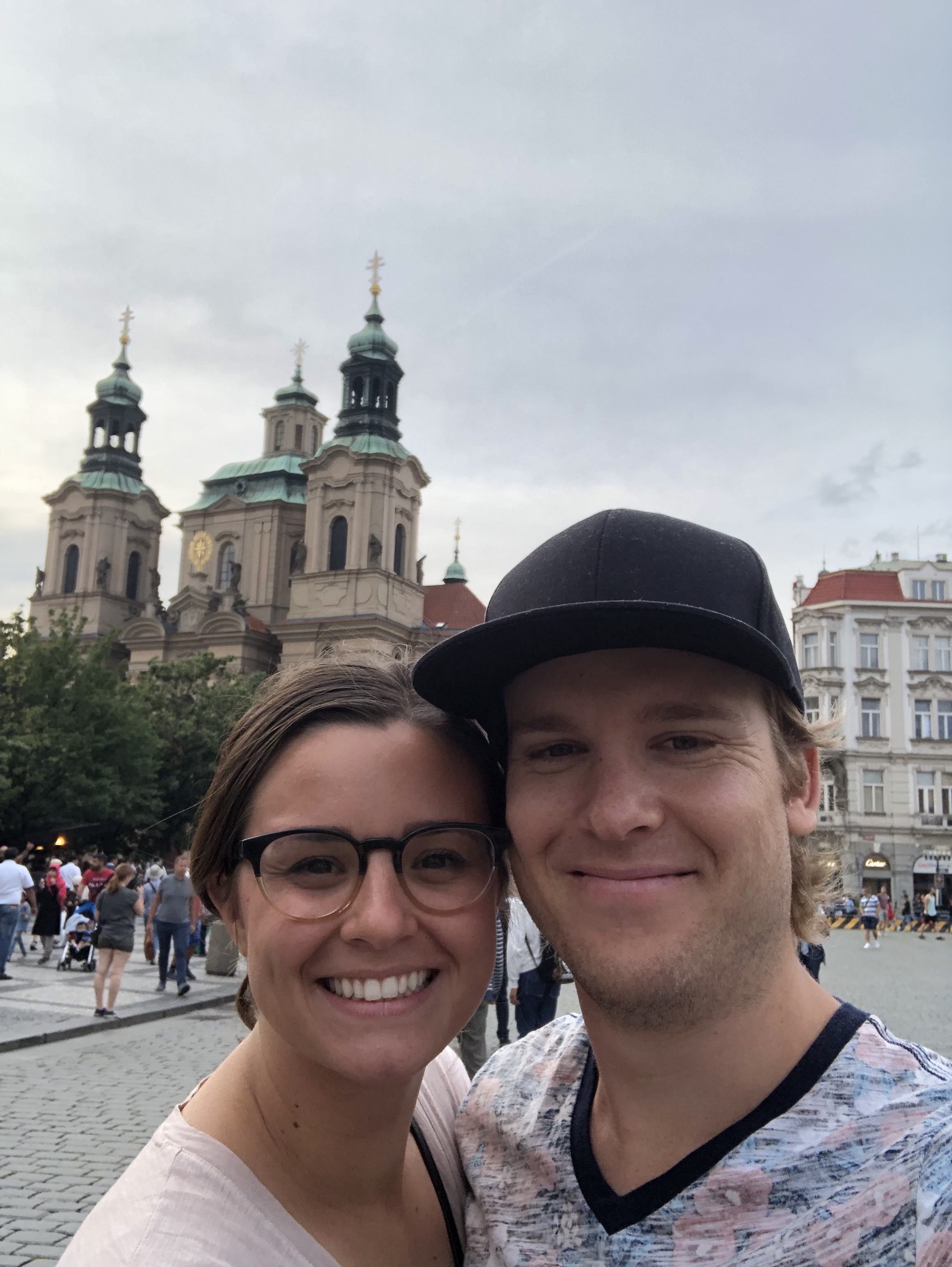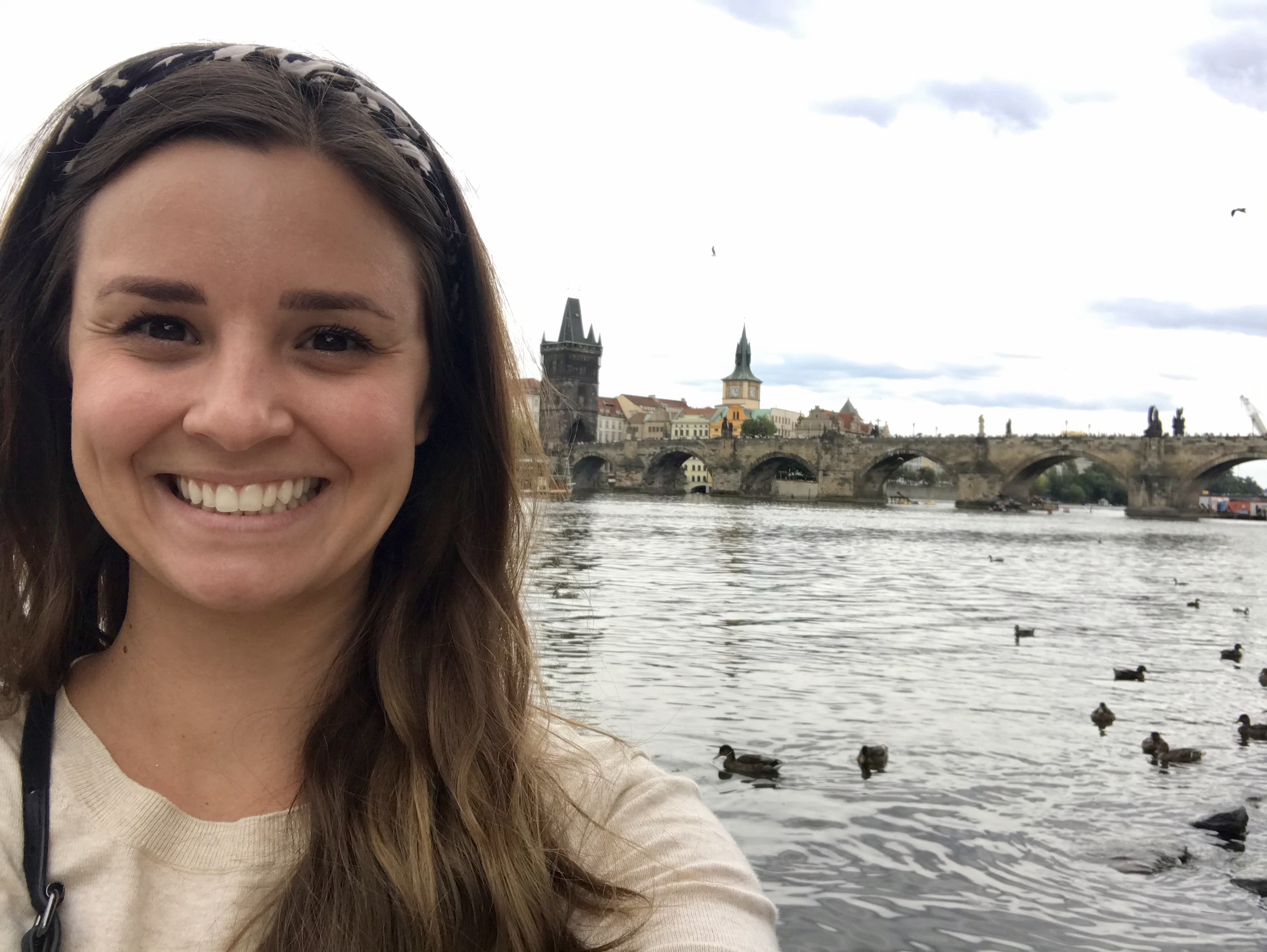 The Starbucks in downtown Prague provided us with the best office space in the world. We had a great view of not only the beautiful buildings, but the Prague Astronomical Clock. After earning a bit of cash, we headed off to check out the Vlatava River and Charles Bridge. We got to see the river but on the way to the bridge it started pouring! We sought refuge in a covered alley and eventually made a run for it to grab some dinner. We were soaked. I ended up drying my shoes out under a bathroom hand dryer, and once we were fed and (sort of) dry we decided to go see the Astronomical Clock chime on the hour. On our walk there, we spotted a rainbow behind one of the churches!