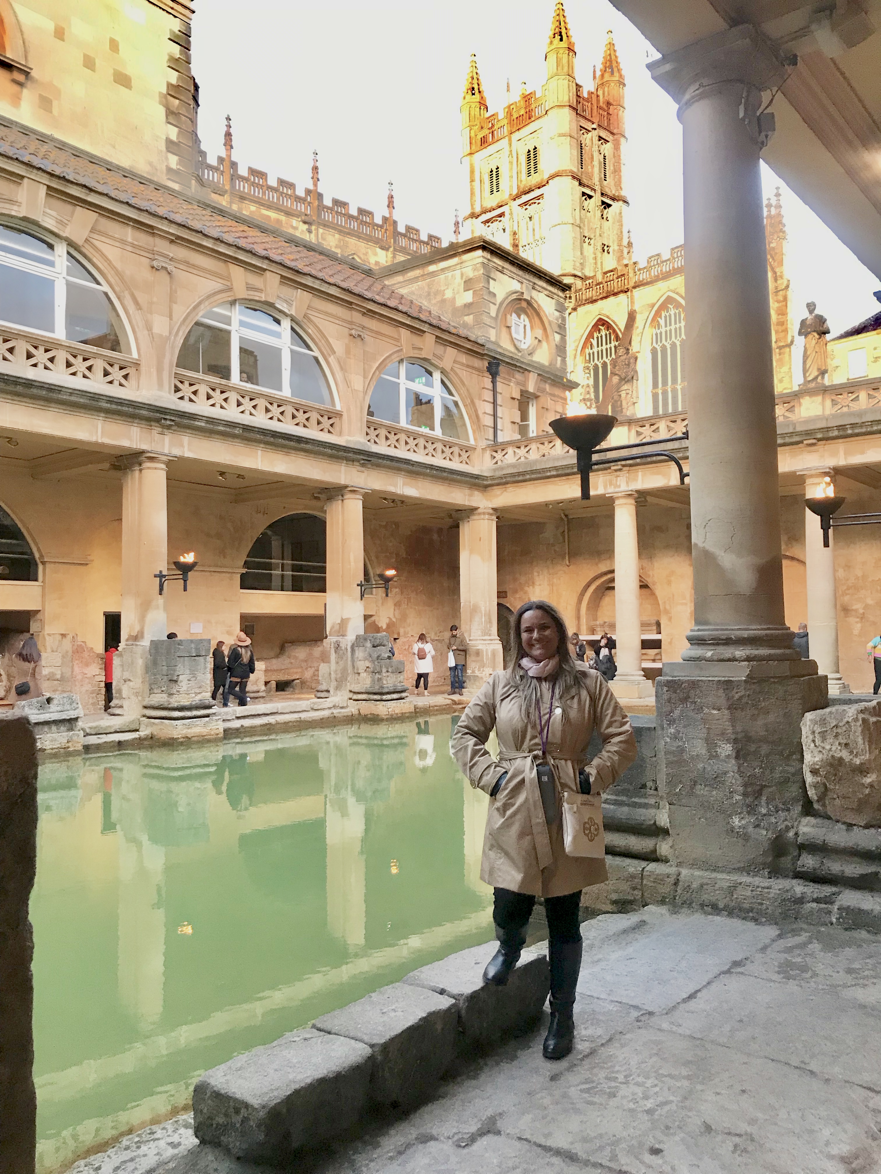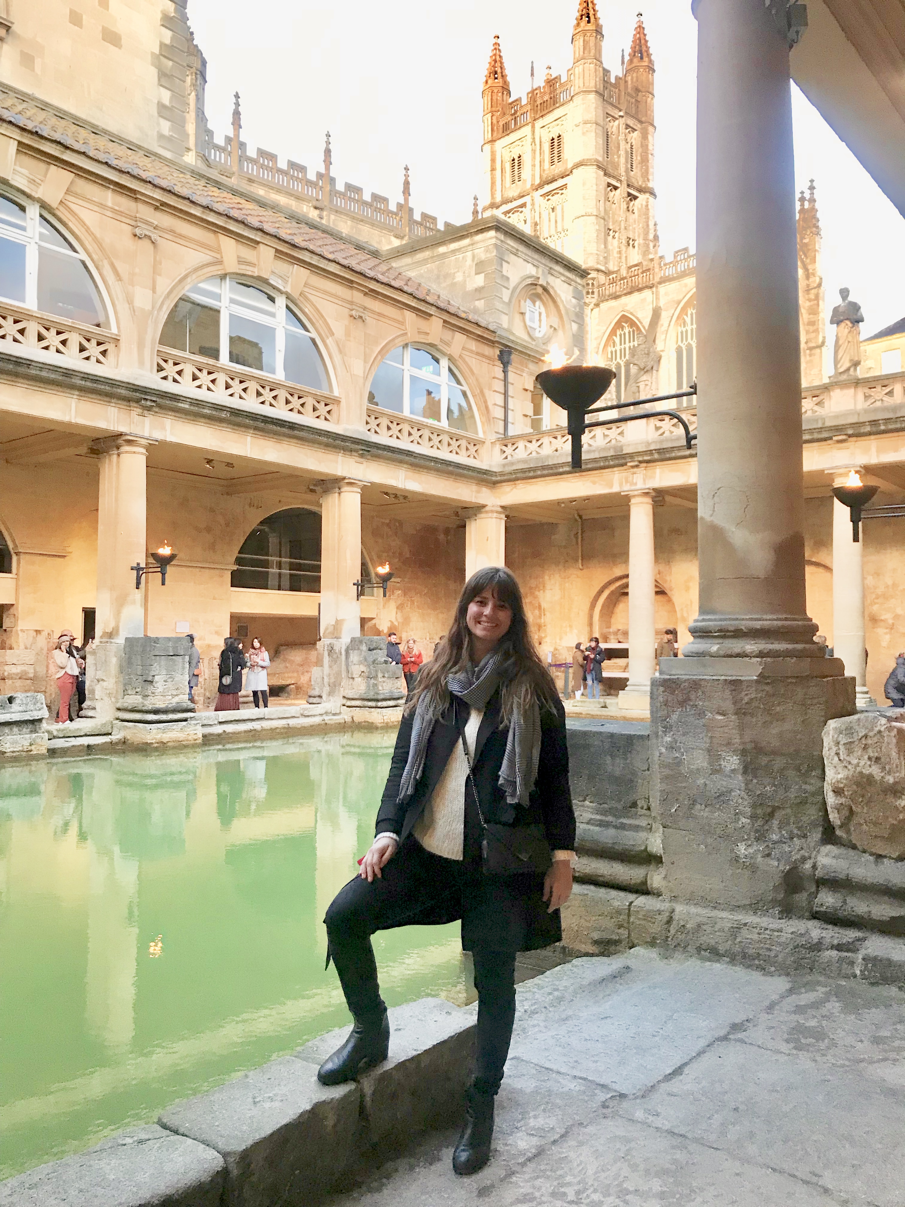 Our third and final stop was the town of Bath, and specifically the Roman Baths. Here, ancient Romans discovered a natural hot spring and used it for a huge bathhouse that also included temples and wells. Because of the minerals in the water, it was very healthy both for bathing and for drinking. Today, it’s a museum that shows what it would have looked like a few thousand years ago and the typical life of those who would have frequented the bathhouse. It is a beautiful building, and we were able to try some of the bathwater for ourselves!